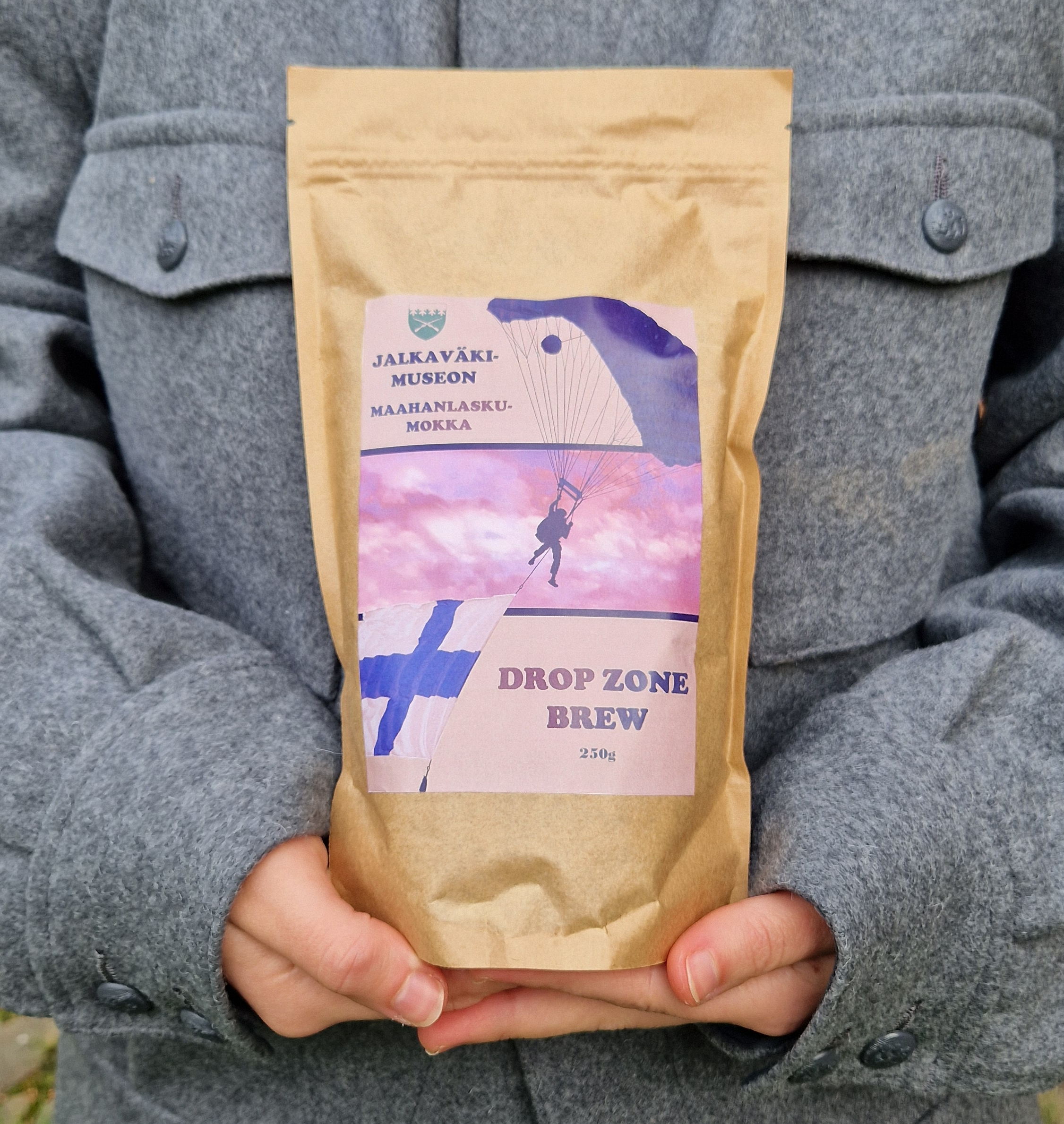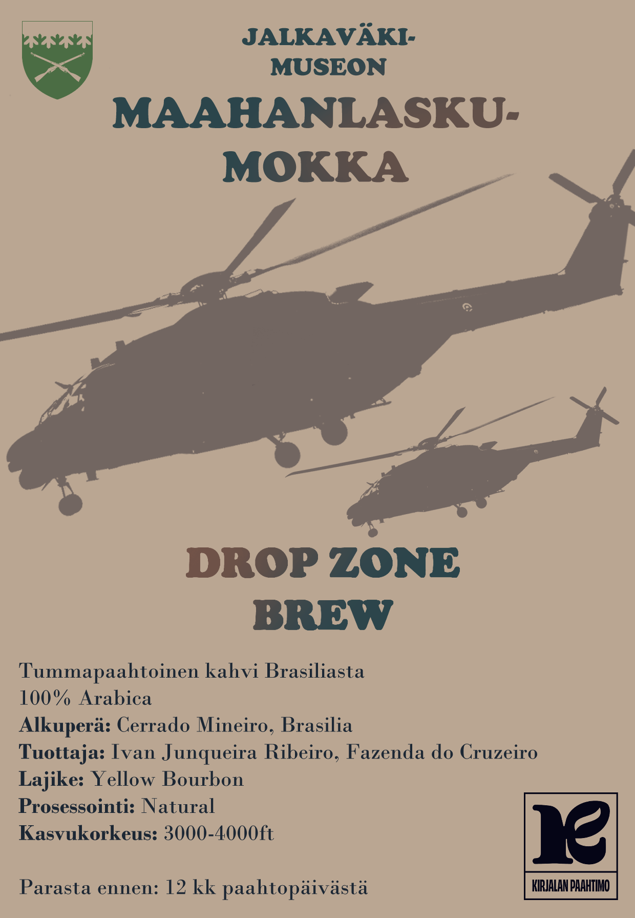 DROP ZONE BREW – Maahanlaskumokka. Jalkaväkimuseon ja Kirjalan kahvipaahdon yhteinen tummapaahtoinen kahvi Brasiliasta. Saatavana myös keskipaahtoisena.